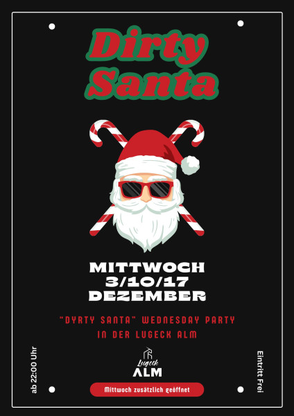 Weihnachtsvorbereitungen Pff heute wird gesündigt, nicht gebastelt. Die Innenstadt glitzert, die Freunde warten und Dirty Santa bringt genau das, was du wirklich brauchst: Party, Chaos & richtig viel Spaß. Wer brav ist, bleibt zuhause. Alle anderen: Lugeck-Alm. Mittwoch. Dirty Santa.