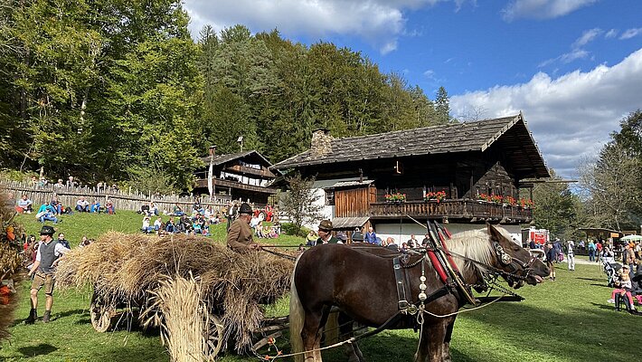Der Erlebnistag beginnt festlich mit dem Erntedankumzug und dem anschließenden Gottesdienst. Danach erwartet die Besucher*innen ein buntes Tagesprogramm: Futterschneiden, eine Traktorparade, Feldarbeit mit Pferden, Dreschen, Mähen, Graswenden und zahlreiche Handwerksvorführungen – von Holzaushacken über Dachdecken und Korbflechten bis hin zum Kraxenbau. Viele Stationen laden dazu ein, selbst Hand anzulegen.